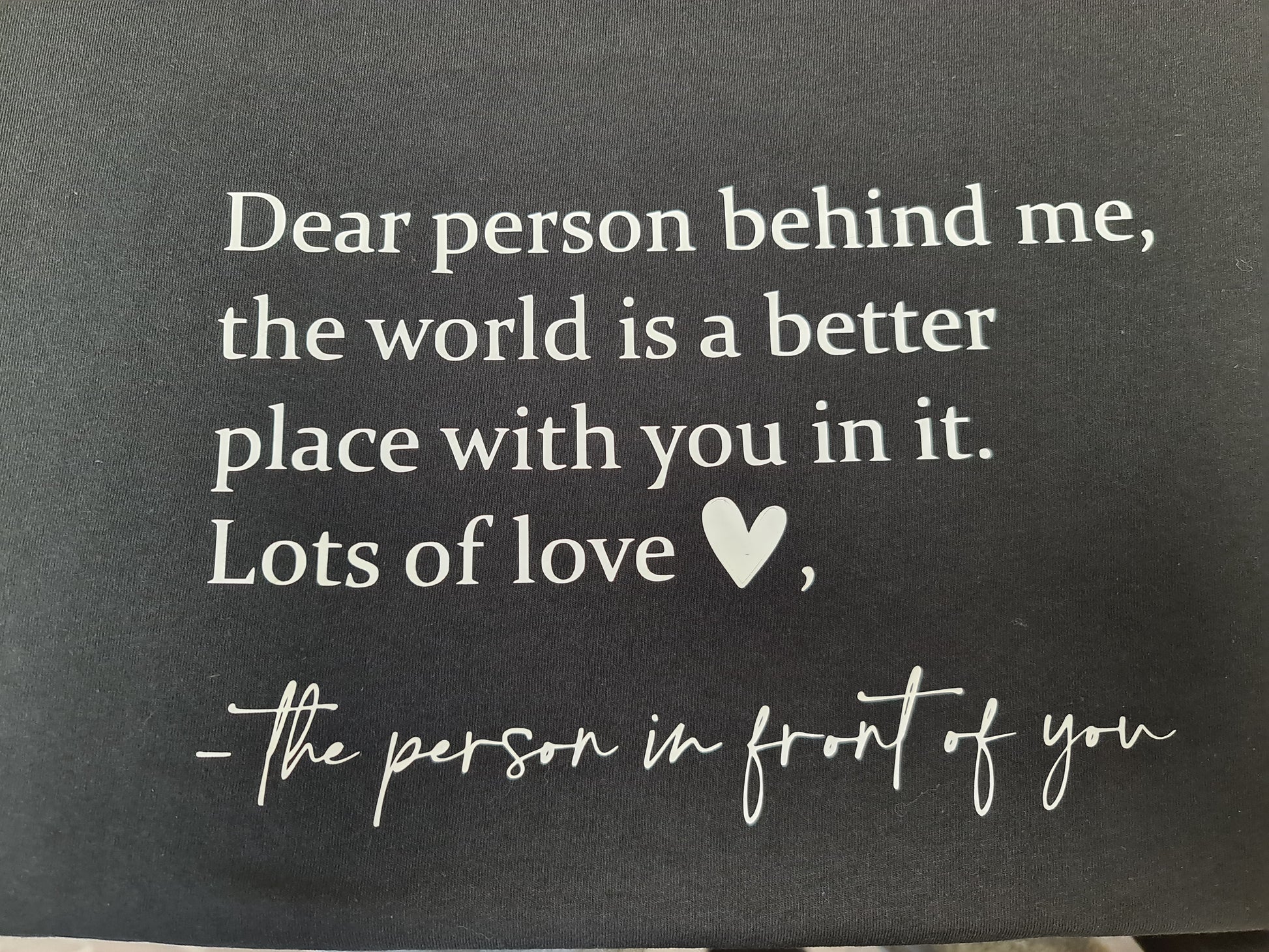 Dear Person Behind me quote on the back of the hoodie,